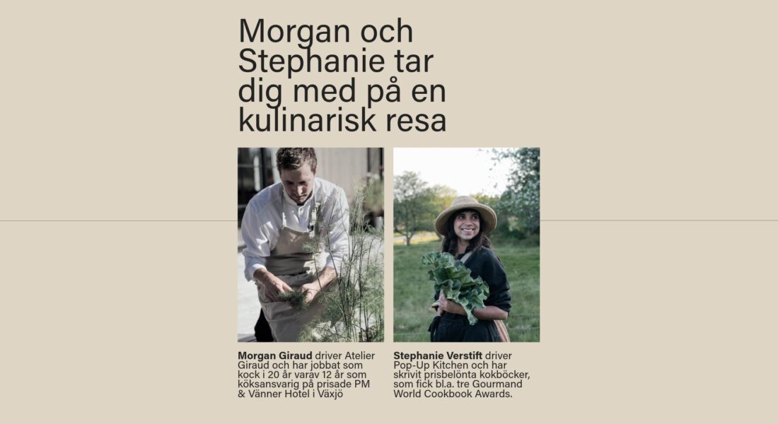 Morgan Giraud (tidigare kökschef hos PM & Vänner Hotel i Växjö) och Stephanie Verstift (triple vinnare Gourmand World Cookbook Awards) tar dig med på en kulinarisk resa. Njut av en unik upplevelse mellan Boda Glasbruks gamla glasugnar.