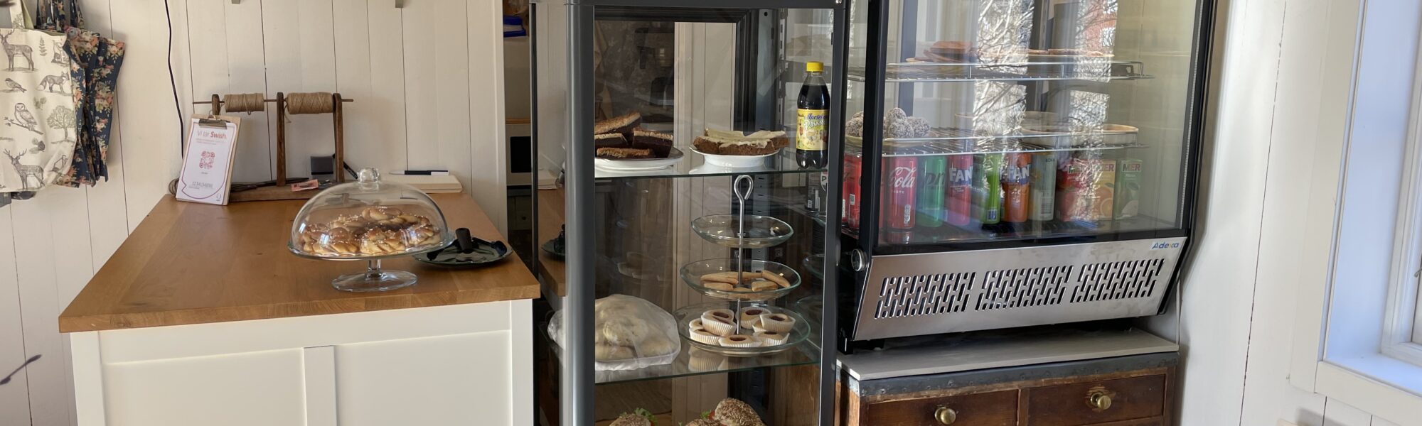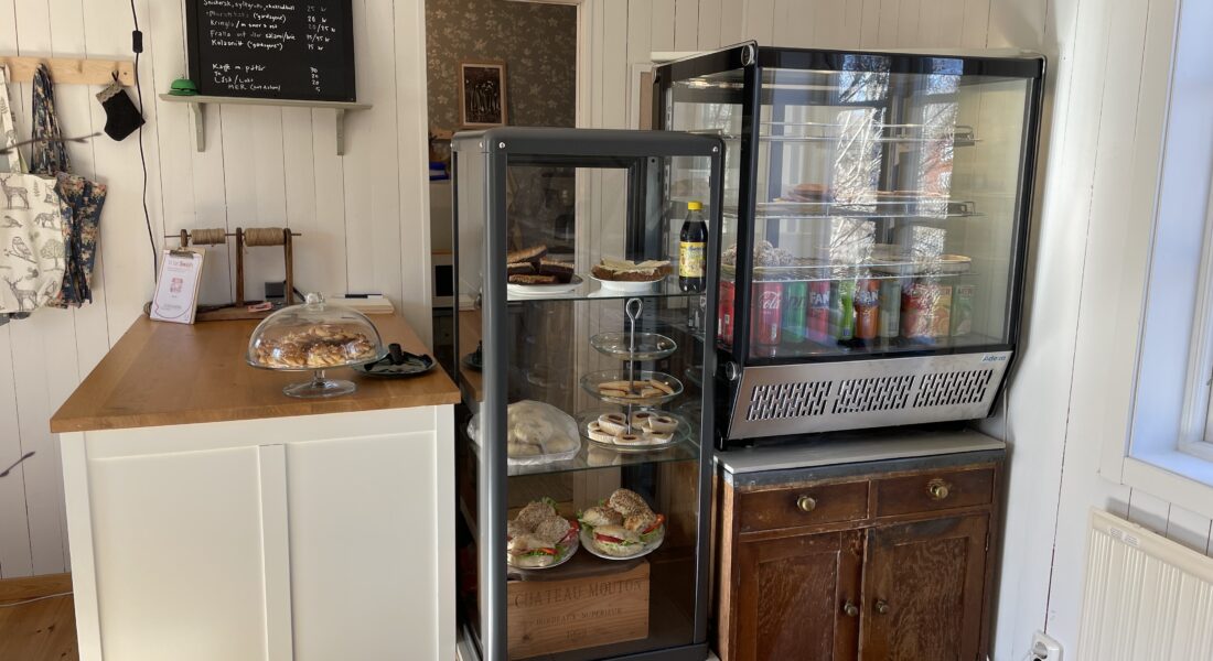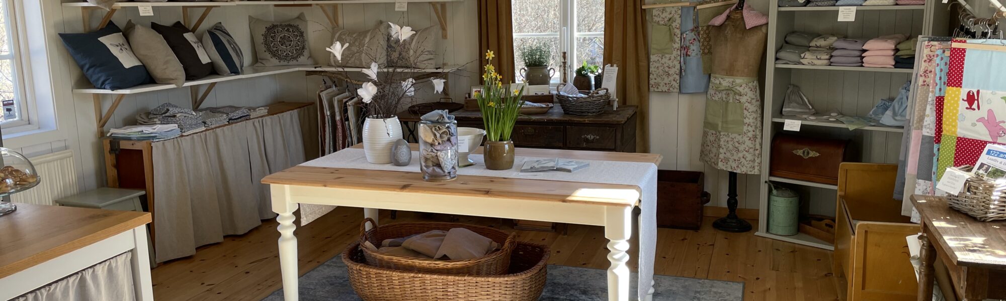 I caféet serveras kakor samt matiga frallor. I butiken hittar du hemtextil i egen design.
